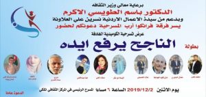 مندوبا عن وزير الثقافة الدكتور باسم الطويسي رعى مستشاره مساعد الأمين العام في الوزارة الدكتور أحمد راشد عرضا مسرحيا كوميديا بعنوان “الناجح يرفع ايده”، الذي أقامته فرقة فرانكو أرب المسرحية مساء الاثنين 2/12/2019 على مسرح هاني صنوبر في المركز الثقافي الملكي بعمان بحضور عدد من الفنانين والمهتمين. والمسرحية من إخراج بسام المصري وبطولة الفنان نضال البتيري، والفنانة صفاء العلي بمشاركة عدد من الفنانين