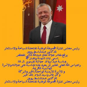 الدكتور عبدالباسط روبين:رئيس مجلس ادارة المجموعة الوطنية المتحدة للسياحة والاستثمار يهنئ جلالة الملك عبدالله الثاني بعيد ميلاد جلالته الميمون