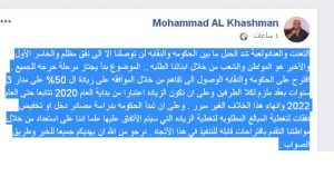 الكابتن محمد الخشمان يقدم مقترح لحل ازمة اضراب المعلمين في تغريدة له وعلى صفحته المشهورة على حسابه في الفيسبوك