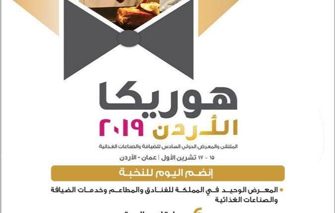 تحت رعاية معالي وزير السياحة والأثار ، ينظم الملتقى والمعرض الدولي السادس للضيافة والصناعات الغذائية والتجهيزات الفندقية “هوريكا الأردن 2019” في الدوره السادسه – في معرض عمان الدولي للسيارات في الفترة الواقعة ما بين 13-15/10/2019. وذلك بالتعاون مع و بدعم من وزارة السياحة والآثار، هيئة تنشيط السياحة، جمعية الفنادق الأردنية، وجمعية المطاعم السياحية الاردنيه.