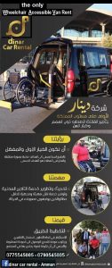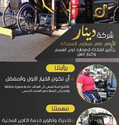 وشركة (شركة دينار لتأجير السيارات) الرائدة في توفير النقل للمعاقين وذوي الاحتياجات الحركية الخاصة باحترافية وتجهيزات تلائم كل الاحتياجات الحركية الخاصة تستحق الشكر والثناء والتقدير وتوفر وسائل الاتصال والاستفسار وطلب خدماتها والحجز اون لاين وعبر الهاتف وعلى مدار الساعة ،