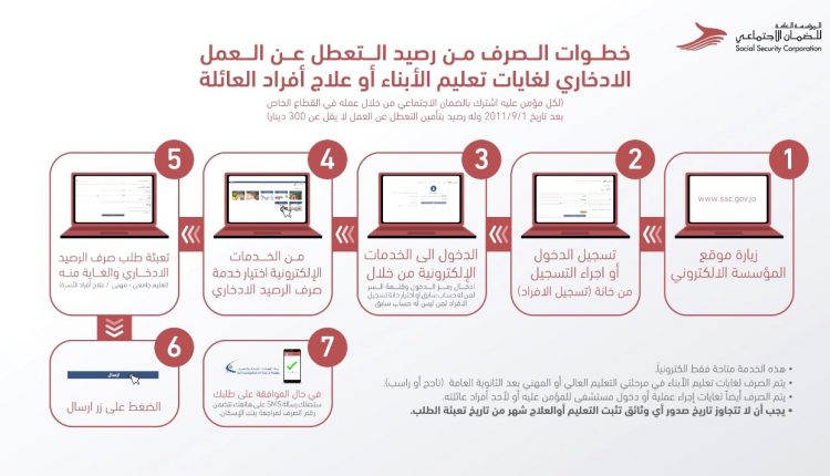 وأفاد الرحاحلة أن إطلاق الموقع الجديد للمؤسسة رافقه إتاحة خدمة إلكترونية خاصة بسحب المؤمن عليه الأردني من رصيده الادخاري بحد أقصى (75%) في تأمين التعطل عن العمل لغايات تعليم أبنائه في مرحلتي التعليم العالي والمهني، أو تغطية نفقات المعالجة الطبية له أو لأحد أفراد عائلته والتي سيستفيد منها المؤمن عليهم الاردنيون الذين لهم فترات عمل في القطاع الخاص بعد تاريخ 2011/9/1 وهو التاريخ الذي بدأ فيه تطبيق تأمين التعطل عن العمل على العاملين في القطاع الخاص على أن لا يقل رصيدهم الادخاري بتأمين التعطل عن 300 دينار، مشيراً أن خدمة الصرف من هذا الرصيد متاحة بشكل إلكتروني فقط من خلال الموقع الالكتروني للمؤسسة، ولن تستقبل المؤسسة بجميع فروعها أي طلب يتعلق بهذا الخصوص إلا عبر هذا الموقع الذي يتيح للمؤمن عليه كافة التفاصيل المتعلقة بذلك بما فيها رصيده في حساب التعطل عن العمل، ويتعين على المؤمن عليه الراغب بتقديم طلب الصرف الدخول على الموقع الالكتروني للمؤسسة وتسجيل الدخول أو اجراء التسجيل من خانة تسجيل الأفراد ومن ثم الدخول إلى الخدمات الإلكترونية يلي ذلك اختيار خدمة صرف الرصيد الادخاري ومن ثم تعبئة طلب الصرف، وارفاق الوثائق المطلوبة ثم الضغط على زر ارسال، منوهاً أنه يتبع ذلك دراسة الطلب من قبل المؤسسة والتحقق من الوثائق والشروط وفي حال الموافقة على طلب المؤمن عليه سيصله رسالة نصية على هاتفه الجوال تتضمن رقم الصرف لمراجعة بنك الإسكان واستلام المبلغ، علماً بأنه لا يترتب على المؤمن عليه اعادة المبالغ التي ستصرف من رصيده الادخاري بتأمين التعطل عن العمل للمؤسسة .