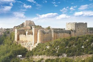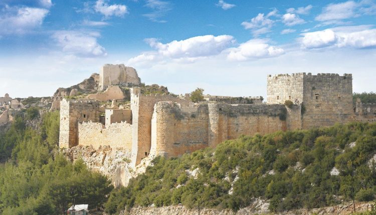 على الجزء الشمالي من الجبال الساحلية المطلة على الطريق الفرعي الذي يمر عبر الجبل بين مدينة اللاذقية وسهل الغاب الشمالي، تقبع قلعة صلاح الدين الأيوبي، حيث يقابلك طريق ضيق متعرج بانحدارات حادة مطلة على وادٍ عميق في ربوع جبلية خلابة، يحيط بك عند وصولك خندق حجري بعمق 30 مترا تقريباً على طول طريق معبّد يتوسطه عمود صخري على شكل مسلة، يتألف من قسمين، الأسفل منحوت من الصخر، والعلوي مشكل معمارياً من الحجارة والطين لأهداف عسكرية، حيث كان يربط هذا العمود بين المدينة والقلعة التي يسكنها الحاكم الصليبي، استخدم آنذاك لمد جسر متحرك ينقل العامة لداخل القلعة.