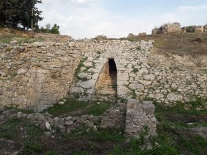وإلى الشرق من حي القصور حيٌ سكني يمتاز بمنازله الواسعة، وتخترقه شوارع رئيسية عدة يتفرع منها بعض الشوارع الجانبية المتعرجة التي تبدو ضيقة عند نهايتها المغلقة. تتكون منازل المدينة من أقسام عدة، فالمدخل يتبعه درج ورواق وأحياناً بئر ماء وحمامات موصولة بقنوات لمجاري المياه وفناء أو ساحة متصلة مباشرة مع المدخل والرواق وتتوزع حولها الغرف أو المحلات والمشاغل. وقد لوحظ في هذه البيوت أن الموتى كانوا يدفنون في منازلهم. ويتصف القبر المنزلي بأنه عبارة عن سرداب للدفن له مدخل على شكل حفرة أو درج.