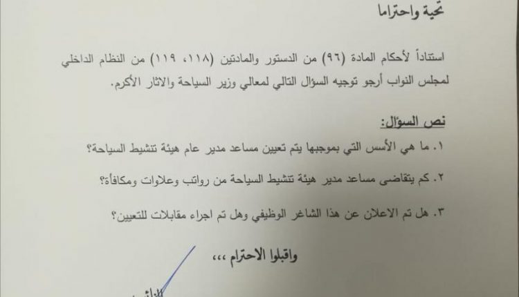 وجه النائب محمود الطيطي سؤالا لمعالي وزيرة السياحة والاثار وبصفتها رئيسة مجلس ادارة هيئة تنشيط السياحة الاردنية ، حيث شمل السؤال استفسارا حول الأسس التي تم بموجبها تعيين مساعدا لمدير هيئة تنشيط ،وتضمن الاستفسار عن الراتب وما يشتمال من مزايا وعلاوات ومكافاءات واختتم السؤال او الاستفسار فيما اذا كانت هيئة تنشيط السياحة او الوزارة قد اعلنت عن توفر هذاه الوظيفة وهل تم اجراء مقابلات تنافسية قبل التعيين