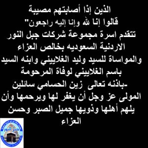 اسرة مجموعة شركات جبل النور الاردنية السعودية:تتقدم بالعزاء والمواساة لآل الغلايني والحسامي بوفاة المرحومة زين الحسامي