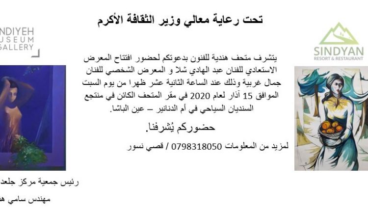 معرض الاستعادي للفنان عبدالهادي شلاوالمعرض الشخصي للفنان جمال غربية -15اذار في متحف هندية مركز جلعاد الثقافي -منتجع السنديان السياحي