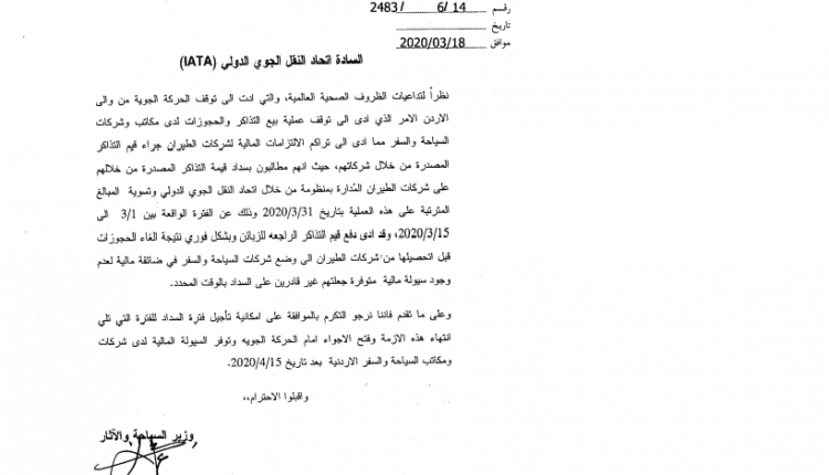 وجهت السياحة الاردنية كتابا دعت فيه اتحاد النقل الجوي الدولي IATA لتاجيل وتسوية تحصيل قيمة التذاكر المصدرة من شركات الطيران لوكلاء السياحة والسفر ،نظرا للظروف الحاليةك وما رافق ذلك من الغاء حجوزات ودربكة في قطاع السفر وفي ما يلي صورة الكتاب