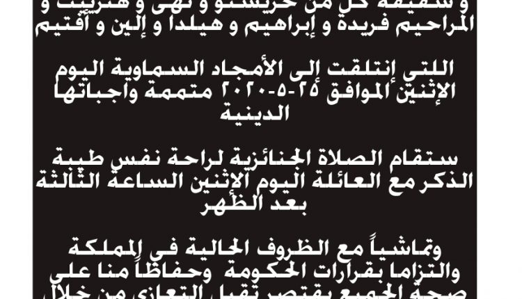 وتماشياً مع الظروف الحالية في المملكة والتزاما بقرارات الحكومة وحفاظاً منا على صحة الجميع يقتصر تقبل التعازي من خلال وسائل التواصل الاجتماعي أو عبر الهاتف وسيتم الإعلان عن موعد جناز الثالث والتاسع والاربعين عن راحت نفس طيبة الذكر في تاريخ لاحق حين تسمح الظروف بذلك