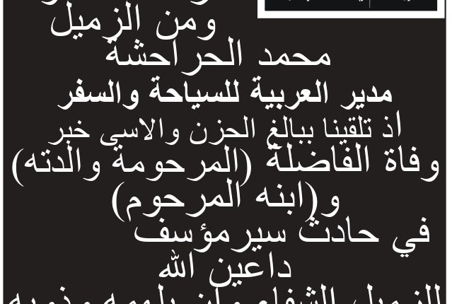 عزاء ومواساة للزميل محمد الحراحشه وال الحراحشه الكرام -مدير العربية للسياحة والسفر بوفاة المرحومة والدته والمرحوم نجله