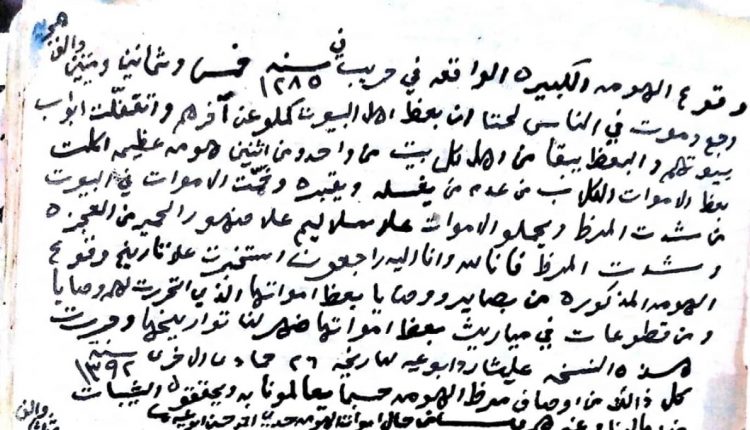 وتقول الوثيقة، إنه “في 1285 هجرية (1868)، وقع موت في الناس حتى أن بعض أهل البيوت كملوا (قضوا) عن آخرهم وتقفلت أبواب بيوتهم”، أي قضوا عن آخرهم ولم يجدوا من يخلفهم فيها.
