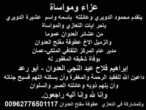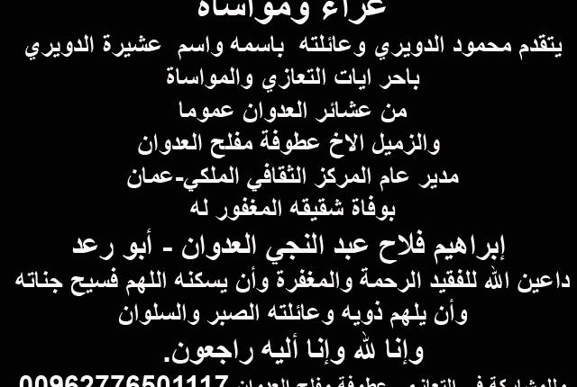 اعلانات في الاخبار-Ads in the newsتعازي محمود الدويري يتقدم باحر ايات التعازي والمواساة بوفاة (المرحوم إبراهيم فلاح عبد النجي العدوان – أبو رعد)-شقيق عطوفة مفلح العدوان اخر تحديث يوليو 14, 2020 2٬759 مشاركة عزاء ومواساة يتقدم محمود الدويري وعائلته باسمه واسم عشيرة الدويري باحر ايات التعازي والمواساة من عشائر العدوان عموما والزميل الاخ عطوفة مفلح العدوان مدير عام المركز الثقافي الملكي-عمان بوفاة شقيقه المغفور له إبراهيم فلاح عبد النجي العدوان – أبو رعد داعين الله للفقيد الرحمة والمغفرة وأن يسكنه اللهم فسيح جناته وأن يلهم ذويه وعائلته الصبر والسلوان وإنا لله وإنا أليه راجعون. وللمشاركة في التعازي عطوفة مفلح العدوان 00962776501117 2٬759 مشاركة