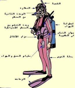 النظارة, وهي لابد وان تكون من نوعية جيدة كما ينصح باستخدامها ايضا في حمامات السباحة لوقاية العين من مادة الكلور الموجودة به. قصبة التنفس : حيث لا يتم استخدامها الا عندما يكون الغواص على سطح المياه وهذه الطريقة افضل من ان يرفع رأسه بين الحين والاخر لاستنشاق الهواء. الزعانف : كما ان المركب لا تسير الا بالمروحة الخلفية الموجودة مثلها مثل الغواص لا يستطيع التحرك بحرية وبأقل مجهود الا بوجود هذه الزعانف المثبته بقدمه حيث تعطيه سرعة وسهولة في التحرك اكثر بكثير من عدم وجودها. بدلة الغطس : وهي ليست مجرد بدلة يتم ارتداؤها بل لابد وان تكون لها مواصفات معينة حيث يتحقق بها العزل من البرودة والاحتكاك كما انها مصنوعة من مادة تعطي الجسم السهولة في الطفو على سطح الماء دون اي مجهود. وحدة التنفس : حيث يضعها الغواص في فمه لسحب الهواء من الاسطوانة ولقد صممت خصيصا بطريقة تجعلها تعمل في اي عمق مهما كان ضغط الهواء الخارجي , كما انه يوجد ايضا وحدة التنفس الاحتياطية في حال احتاج اليها الغواص الاخر الموجود معه في نفس الرحلة. حزام الاثقال : بدون هذا الحزام لا يستطيع الغواص النزول الى اعماق بعيدة حيث يتم وضع الاوزان بهذا الحزام مناسبة مع وزن الغواص نفسه. مقياس ضغط الهواء والعمق : هذا هو منظم الرحلة تحت المياه حيث يبين لك العمق الذي وصلت اليه كما انه يبين لك كمية الهواء المضغوط المتبقية بالاسطوانة وبناء عليه يقوم الغواص بتحديد مدة بقائه تحت المياه حتى لا يفاجأ الغواص بعدم وجود اكسجين لديه وهو على اعماق ليست بالقريبة من سطح المياه.