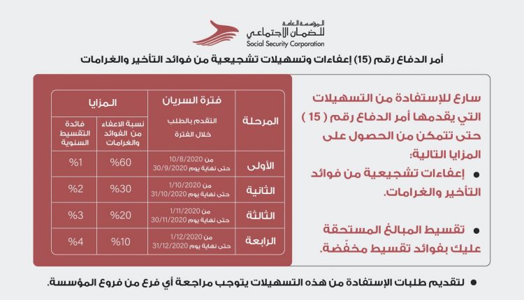 دعت المؤسسة العامة للضمان الاجتماعي جميع الأفراد ومنشآت القطاع الخاص الذين ترتّبت عليهم مديونية للضمان الاجتماعي إلى مراجعة فروعها للاستفادة من أمر الدفاع رقم (15) لسنة 2020 المتضمن تقسيط أو إعادة جدولة المبالغ المستحقة عليهم واعفائهم من الفوائد والغرامات بنسب متفاوتة.