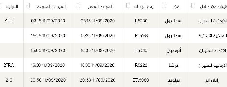 | الاردنية للطيران | اسطنبول | R5280 | 11/09/2020 03:15 | 11/09/2020 03:15 | SRA | في الوقت المحدد | |