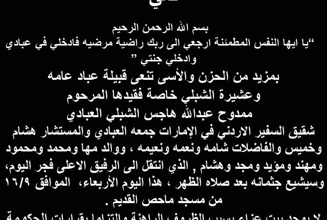 الأخبارتعازي قبيلة عباد عامه وعشيرة الشبلي خاصة تنعي فقيدها المرحوم ( ممدوح عبدالله هاجس الشبلي العبادي) اخر تحديث سبتمبر 16, 2020 1٬349 مشاركة بسم الله الرحمن الرحيم (يا ايها النفس المطمئنة ارجعي الى ربك راضية مرضيه فادخلي في عبادي وادخلي جنتي) بمزيد من الحزن والأسى تنعى قبيلة عباد عامه وعشيرة الشبلي خاصة فقيدها المرحوم ممدوح عبدالله هاجس الشبلي العبادي شقيق السفير الاردني في الإمارات جمعه العبادي والمستشار هشام وخميس والفاضلات شامه ونعمه ونعيمه ، ووالد مها ومحمد ومحمود ومهند ومؤيد ومجد وهشام , الذي انتقل الى الرفيق الاعلى فجر اليوم، وسيشيع جثمانه بعد صلاه الظهر ، هذا اليوم الأربعاء، الموافق ٩/١٦ من مسجد ماحص القديم . ملاحظة : يوجد بيت عزاء بسبب الظروف الراهنة والتزاما بقرارات الحكومة وحفاظًا على صحه وسلامة الجميع تقبل التعازي هاتفيًا وعبر وسائل التواصل الاجتماعي. إنا لله وإنا إليه راجعون 1٬349 مشاركة