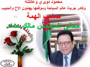 اعلانات في الاخبار-Ads in the newsاعلانات-واخبار-قصيرة-Ads-and-short news عالم السياحة ممثلة برئيس تحريرها محمود الدويري يهنئون معالي (صاحب الهمة) المهندس مالك حداد بالسلامة في سبتمبر 23, 2020 7٬181 مشاركة عالم السياحة ممثلة برئيس تحريرها محمود الدويري وعائلته يهنئون معالي (صاحب الهمة) المهندس مالك حداد بالسلامة 7٬181 مشاركة