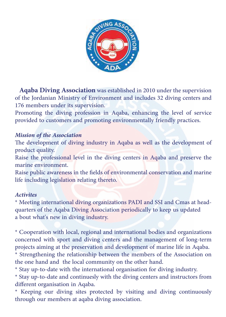 بادرت جمعية العقبة للغوص باصدار مجلة باسم الجمعية خدمة لقطاع ورياضات الغوص اسهاما من ادارة الجمعية ورؤيتها الحالية والمستقبلية وايمانا واستجابة لدور الجمعية في توعية محلية باهمية سياحة الغوص محليا وعالميا وكونها جاذب لاستقطاب سياحة الغوص في خليج العقبة لما يتمتع به مزايا وكونه المفتاح والمنطلق للمثلث الذهبي بسحر مكوناته النادرة بيئيا وتاريخيا (رم-البتراء-العقبة) وحسب تطلعات رئيس الجمعية الزميل الكابتن خماش طه ياسين وزملائه والعاملين في القطاع من مستثمرين وتلبية لاهتمام صاحب الجلالة الملك عبدالله الثاني ودعوته للاهتمام بالسياحة عموما والعقبة بشكل خاص واولية جمعية العقبة للغوص في مناسبات كثيرة