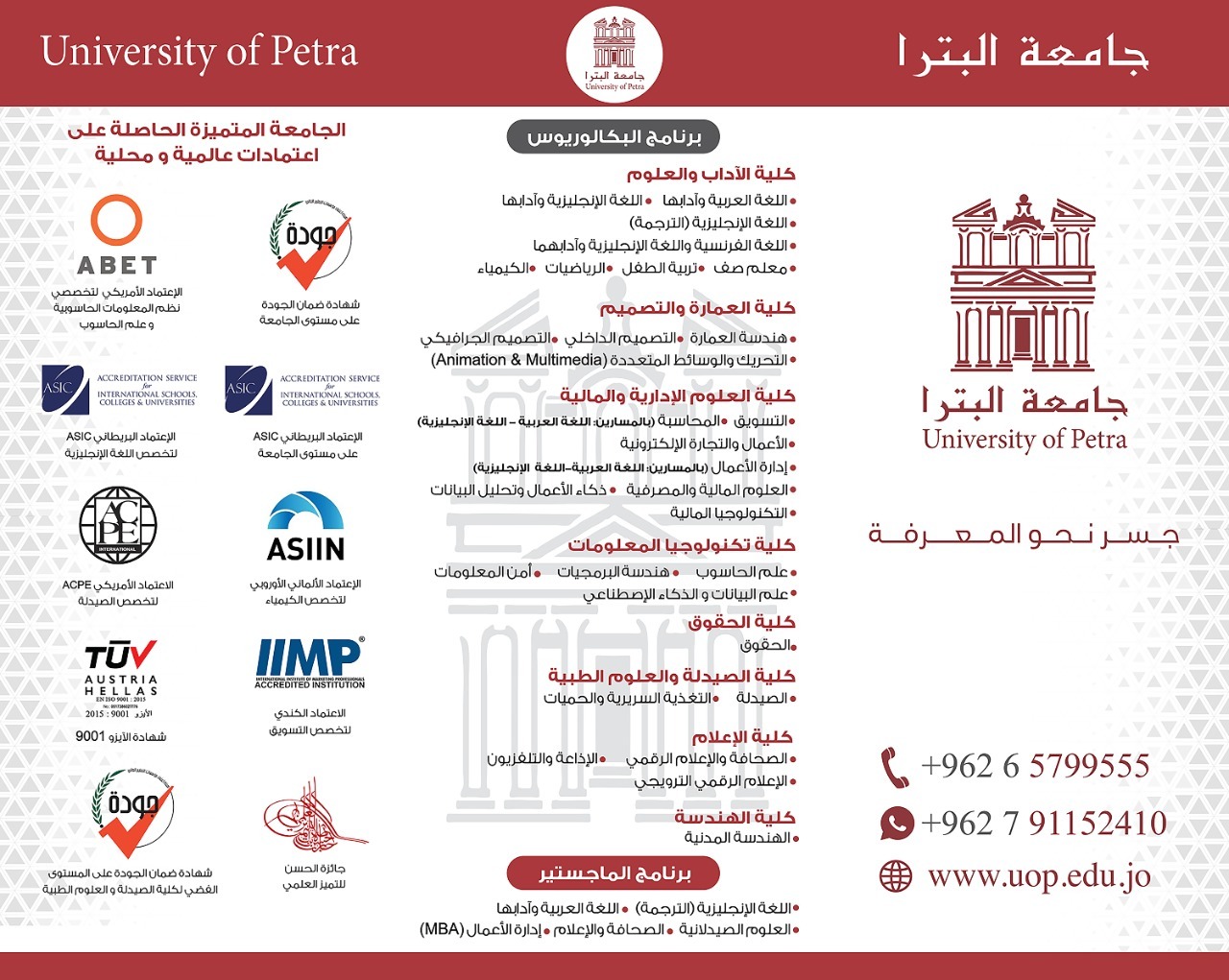 اعلانات في الاخبار-Ads in the newsالأخبار جامعة البتراء – جسر نحو العلوم والمعرفة وايقونة الجامعات الاردنية في مارس 2, 2022 1٬660 مشاركة جامعة البتراء – جسر نحو العلوم والمعرفة وايقونة الجامعات الاردنية 1٬660 مشاركة