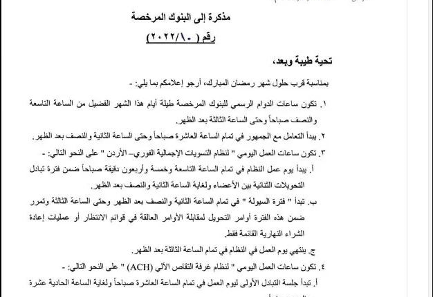 البنك المركزي يصدر مذكرة يبين فيه دوام البنوك الاردنية