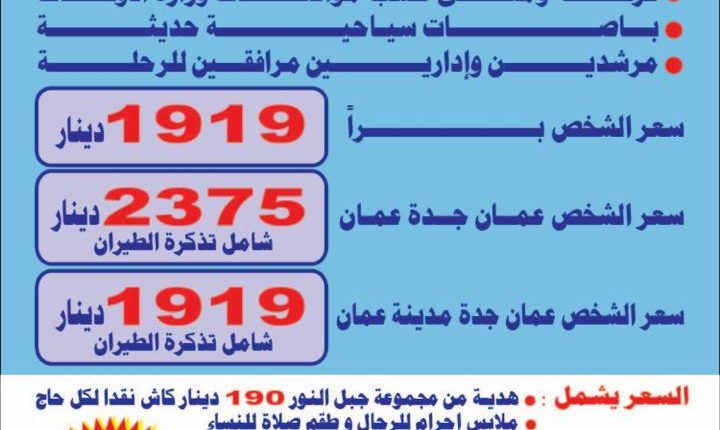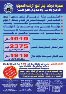 اعلانات في الاخبار-Ads in the newsالأخبار مجموعة شركات جبل النور الاردنية السعودية-عرض الحج المميز في مايو 26, 2022 754 مشاركة عالم السياحة: مجموعة شركات جبل النور الاردنية السعودية-عرض الحج المميز 754 مشاركة