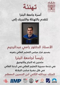 اعلانات في الاخبار-Ads in the newsالأخبار اسرة جامعة البتراء تهنئ الاستاذ الدكتور رامي عبدالرحيم بمناسبة رئيسا للجامعة اخر تحديث أغسطس 16, 2022 841 مشاركة 841 مشاركة