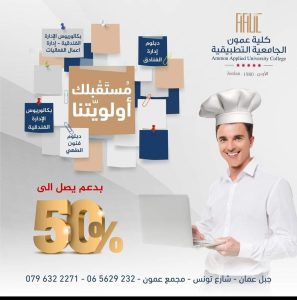 اعلانات في الاخبار-Ads in the newsجامعات/تعليم/تدريب-Universities / Education / Training كليةعمونالجامعية_التطبيقية -الاردن-عمان -aauc (مستقبلك أولويتنا) اخر تحديث أغسطس 20, 2022 1٬056 مشاركة عالم السياحة:اعلان مستقبلك أولويتنا✨ إلتحق بتخصصات البكالوريوس والدبلوم في كلية عمون الجامعية التطبيقية 🔹بكالوريوس الإدارة الفندقية 🔹بكالوريوس الإدارة الفندقية – إدارة أعمال الفعاليات 🔸دبلوم إدارة الفنادق 🔸دبلوم فنون الطهي #منعمونشغلك_مضمون✨ للاستفسار : 065629232 – 0796322271 #كليةعمونالجامعية_التطبيقية #الاردن #عمان #aauc 1٬056 مشاركة