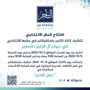 باستثناء يوم الثلاثاء 6/12/2022 ، للتشرف باستقبالكم في قصر الثقافة-المدينة الرياضية-الساعة6:30 للمشاركة في حفل التاجر