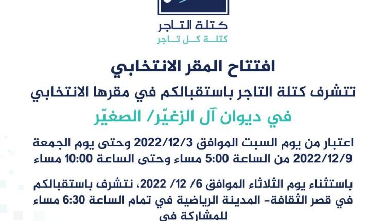 اعلنت كتلة التاجر لانتخابات غرفة تجارة عمان 2022 عن افتتاح مقرها الانتخابي*وحتى يوم الجمعةتاريخ 9/12/2022 ومن الساعة5مساء وحتى الساعة 10 مساء