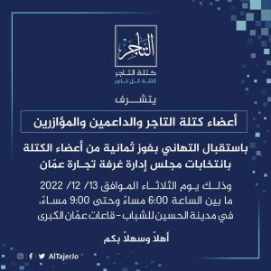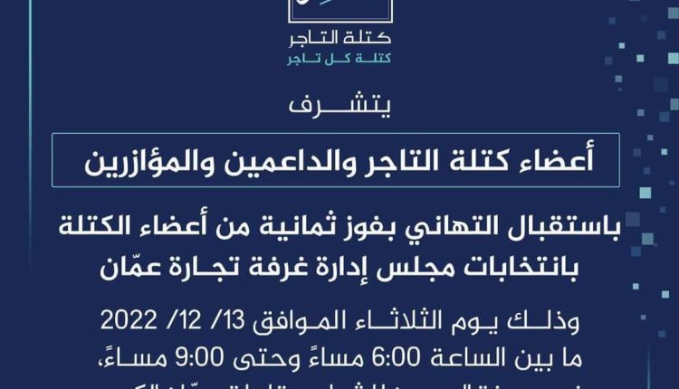 عالم السياحة: اعلنت كتلة التاجر عن استقبالها للمهنئين عن جاهزيتها بترحاب لاستقبال المهتئين اليوم في 13/12/2022 في قاعات عمات الكبرى في امدينة الحسين للشباب -ومن الساعة 6 مساء وحتى 9مساء