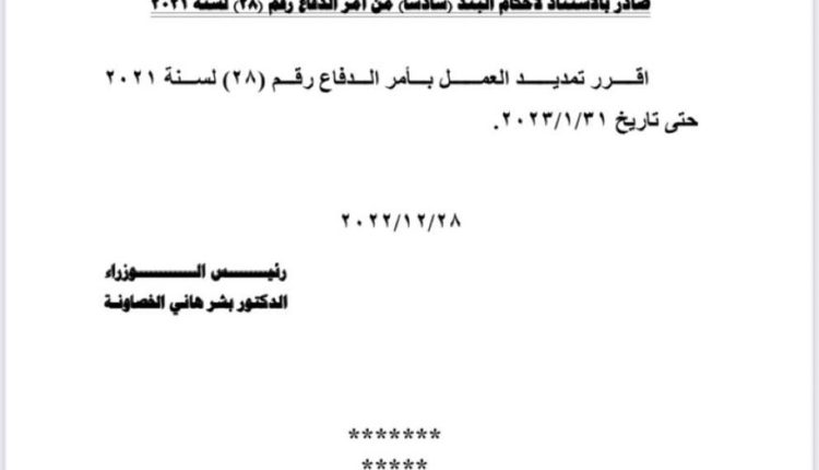 قرَّر رئيس الوزراء الدكتور بشر الخصاونة، اليوم الأربعاء، تمديد العمل بأحكام أمر الدِّفاع رقم (28) لسنة 2021م، الصَّادر بمقتضى أحكام قانون الدفاع رقم (13) لسنة 1992م، والمتعلِّق بحبس المدين، لمدَّة شهر، وتحديداً حتَّى تاريخ 31/1/2023.