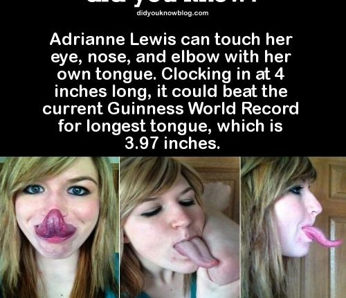 هل سمعت من قبل عن فتاة تلمس عينيها بلسانها؟ إنها حقا قصة غريبة لفتاة أمريكية من ميشيغان تدعى أدريان لويس، لديها واحدة من أطول الألسنة في العالم.يبدو أن الأمر وراثي في عائلتها، فقد كان لعدد من أفراد عائلة والدة أدريان ألسنة طويلة جدا، حيث تقول أدريان: “أشعر كأنني ورثتها، وأصبحت الطفلة الغريبة التي كان عليها أن تمد لسانها”.يبدو أن الأمر وراثي في عائلتها، فقد كان لعدد من أفراد عائلة والدة أدريان ألسنة طويلة جدا، حيث تقول أدريان: “أشعر كأنني ورثتها، وأصبحت الطفلة الغريبة التي كان عليها أن تمد لسانها”