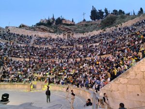 تفاعل أكثر من 10 آلاف شخص مساء اليوم الأحد، مع احتفالات اليوم الثالث من عيد الفطر في المدرج الروماني في عمان، حيث تأتي هذه الاحتفالات ضمن فعاليات وأنشطة رمضانيات 2023 التي جاءت بتنظيم من وزارات: السياحة والآثار، الشباب، الاتصال الحكومي، والداخلية، والثقافة، وأمانة عمان الكبرى.
