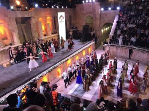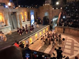 وتم عرض اوبريت “جراسيا – نهر الذهب ” حيث جسّد هذا العمل الفني الغنائي الإستعراضي متعدد الوسائط، مدينة جرش كمهد للحضارات، تحتفي بالإنسانية والفنون والثقافة، مروراً بالعصر الإغريقي، والروماني، والنبطي، والإسلامي.