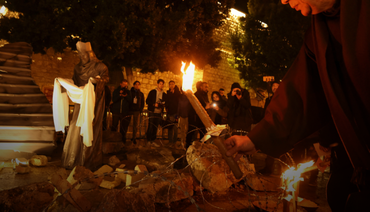 أعياد الميلاد : نصب مجسم تحت عنوان (الميلاد تحت الأنقاض) وذلك بدلا من شجرة عيد الميلاد