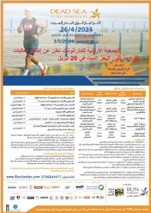 عمان، الأردن (ابريل 2024) تحت رعاية سمو الأمير فراس بن رعد رئيس مجلس إدارة الجمعية الأردنية للماراثونات، أعلنت الجمعية عن إطلاق فعاليات ألترا ماراثون البحر الميت لهذا العام في مسيرته التي استمرت لثمانية وعشرون عاماً، حيث يُقرر إقامته في 26 من شهرابريل لهذا العام، وينطلق تحت شعار “اركض في أخفض بقعة في العالم”والذي تنظمه بالتعاون مع امانة عمان الكبرى برعاية شركة البوتاس ومجموعة من الشركات الاخرى الداعمة.