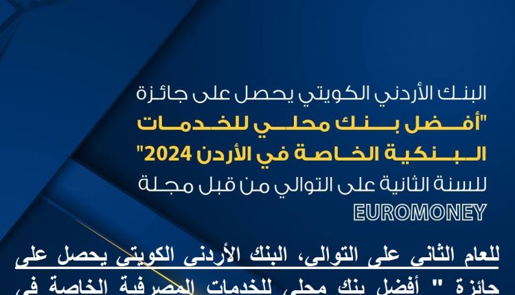للعام الثاني على التوالي، البنك الأردني الكويتي يحصل على جائزة ” أفضل بنك محلي للخدمات المصرفية الخاصة في الأردن 2024 ” من EUROMONEY العالمية