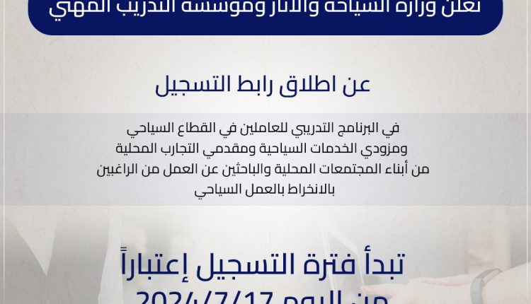 تعلن وزارة السياحة والآثار، ومؤسسة التدريب المهني، عن اطلاق رابط التسجيل في البرنامج التدريبي 2024 للعاملين في القطاع السياحي ومزودي الخدمات السياحية ومقدمي التجارب المحلية من أبناء المجتمعات المحلية والباحثين عن العمل من الراغبين بالانخراط بالعمل السياحي