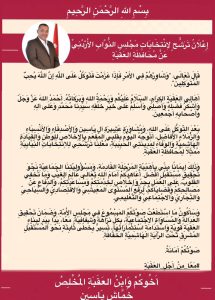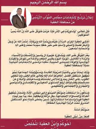 اعلانات في الاخبار-Ads in the newsالأخبار بيان اعلان ترشح ابن العقبة الكابتن خماش طه ياسين لانتخابات مجلس النواب-2024 اخر تحديث أغسطس 6, 2024 758 مشاركة بيان ابن العقبة الكابتن خماش طه ياسين لانتخابات مجلس النواب-2024 (اعلان الترشح) 758 مشاركة
