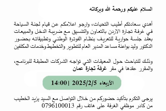 اقتصاد وتكنولوجيا-Economy and Technologyالأخبار غرفة تجارة الاردن تنظم حوار حول نظام الفوترة الوطني (التحديات والمعيقات) ٠ اخر تحديث فبراير 3, 2025 692 مشاركة غرفة تجارة الاردن تنظم حوار حول نظام الفوترة الوطني 692 مشاركة