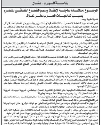 إننا إذ نخاطب دولتكم اليوم، فإننا نرفع إليكم صرخة استغاثة من المستثمرين في القطاع الفندقي و الذي يعتبر حجم الاستثمار فيه بالمليارات لإنقاذ هذا القطاع الحيوي الذي يمثل ركيزة أساسية للاقتصاد الوطني ويساهم بنسبة 15% من الدخل القــومي، ويدرّ دخلاً كبيراً من العملة الصعبة، ويوفر فرص عمل لآلاف الأردنيين، ونرجو من دولتكم التدخل الفوري واتخاذ إجراءات عاجلة، منها على سبيل المثال لا الحصر: