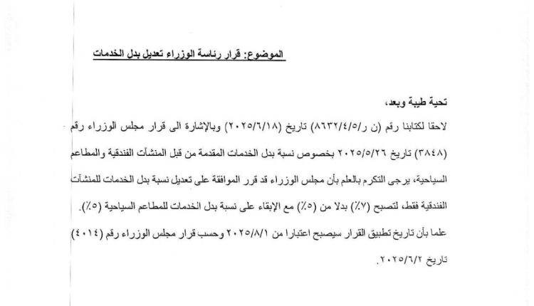 في تعميم اصدرت مفوضية العقبة قرارا تسمح بزبادة بدل الخدمات 2% للمنشئات الفندقية لتصبح 7% بدلا مما كانت عليه سابقا وذلك اعتبارا من 1/8/2025