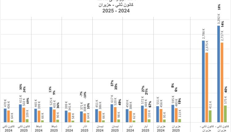أما على مستوى النصف الأول من عام 2025 (الربعين الأولين: كانون الثاني – حزيران)، فقد بلغ إجمالي أعداد الزوار الدوليين 3.292 مليون زائر، بنسبة ارتفاع قدرها 18% مقارنة بالفترة نفسها من عام 2024، التي بلغ فيها عدد الزوار 2.786 مليون زائر.