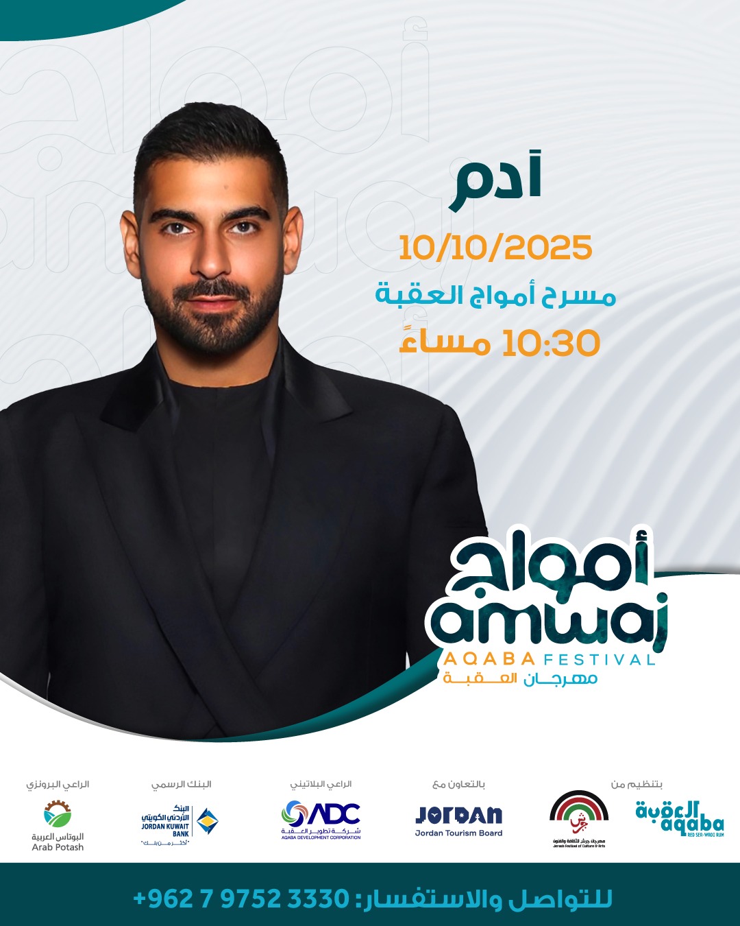 يحيي الفنان اللبناني ” آدم ” حفلاً غنائيًا قريباً في العقبة ، ضمن فعاليات ” مهرجان أمواج العقبة “، مساء يوم الجمعة الموافق 10/10/2025 ، ومن المقرر أن يقدم آدم خلال الحفل باقة متميزة من أشهر أغنياته المحببة لدى جمهوره.