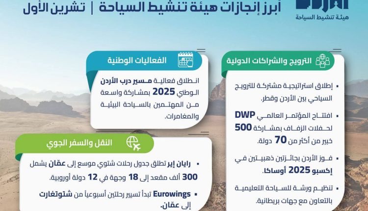 تشارك وزارة السياحة والآثار ودائرة الآثار العامة وهيئة تنشيط السياحة أبرز إنجازات قطاع السياحة والآثار في الأردن خلال شهر تشرين الأول، والتي عكست نشاطاً ملحوظاً في السياحة الداخلية والوافدة، وتقدماً في مشاريع حماية التراث، إلى جانب توسّع جهود الترويج الخارجي. فقد شهد الشهر تنفيذ حملات رقابية وتوعوية، وتطوير مسارات وبرامج سياحية جديدة، وإطلاق مبادرات واتفاقيات هامة، إضافة إلى إدراج مواقع تراثية جديدة على سجلات عالمية. كما شهدت المملكة نمواً في الحركة السياحية، واستضافت فعاليات دولية وعززت تعاونها مع شركات الطيران العالمية. هذه الجهود المشتركة تعكس التزام الوزارة والدائرة والهيئة بدعم السياحة والاثار