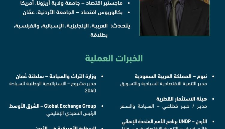 ويتمتع المعايطة بسجل مهني متميز وخبرة واسعة في مجالات التخطيط السياحي، وتسويق الوجهات، وإدارة المشاريع السياحية على المستويين الوطني والدولي، بما يعكس كفاءة عالية ورؤية استراتيجية متقدمة.