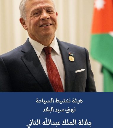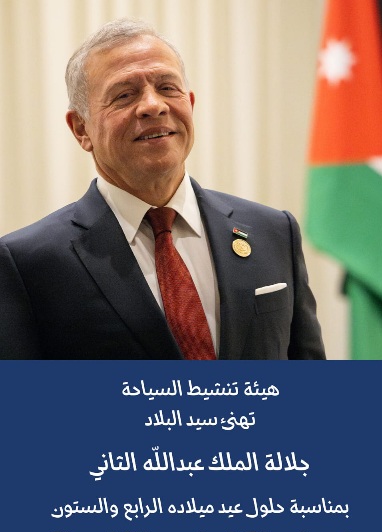 بمناسبة عيد ميلاد حضرة صاحب الجلالة الهاشمية الملك عبد الله الثاني ابن الحسين المعظم الرابع والستون، ترفع هيئة تنشيط السياحة، ممثلة برئيس مجلس إدارة الهيئة ومديرها العام وأعضاء مجلس الإدارة وكافة العاملين فيها، إلى مقام جلالته السامي أسمى آيات التهنئة والتبريك، مقرونة بأصدق مشاعر الولاء والانتماء.