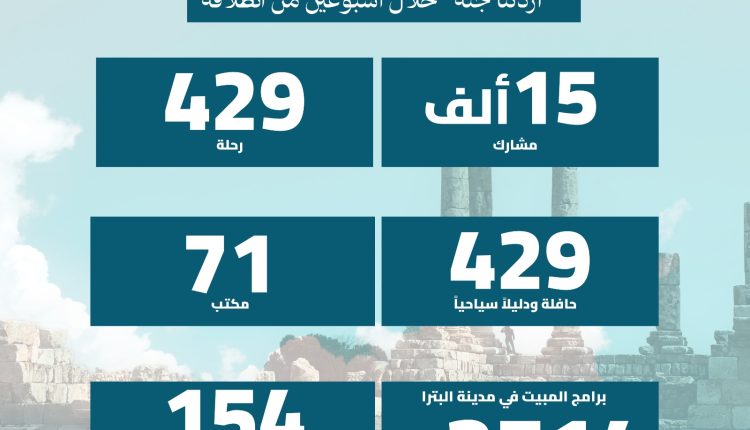 سجل برنامج “أردننا جنة” إقبالاً لافتاً منذ انطلاقه، حيث بلغ عدد المشاركين نحو 15 ألف مشارك خلال الأسبوعين الماضيين، توزعوا على 429 رحلة وحافلة، بمشاركة 429 دليلاً سياحياً، و71 مكتب سياحة وسفر، إلى جانب 35 مطعماً و42 فندقاً ومخيماً سياحياً.