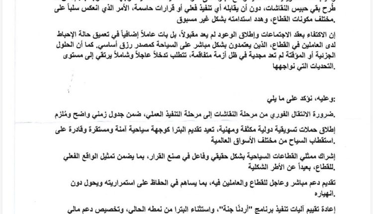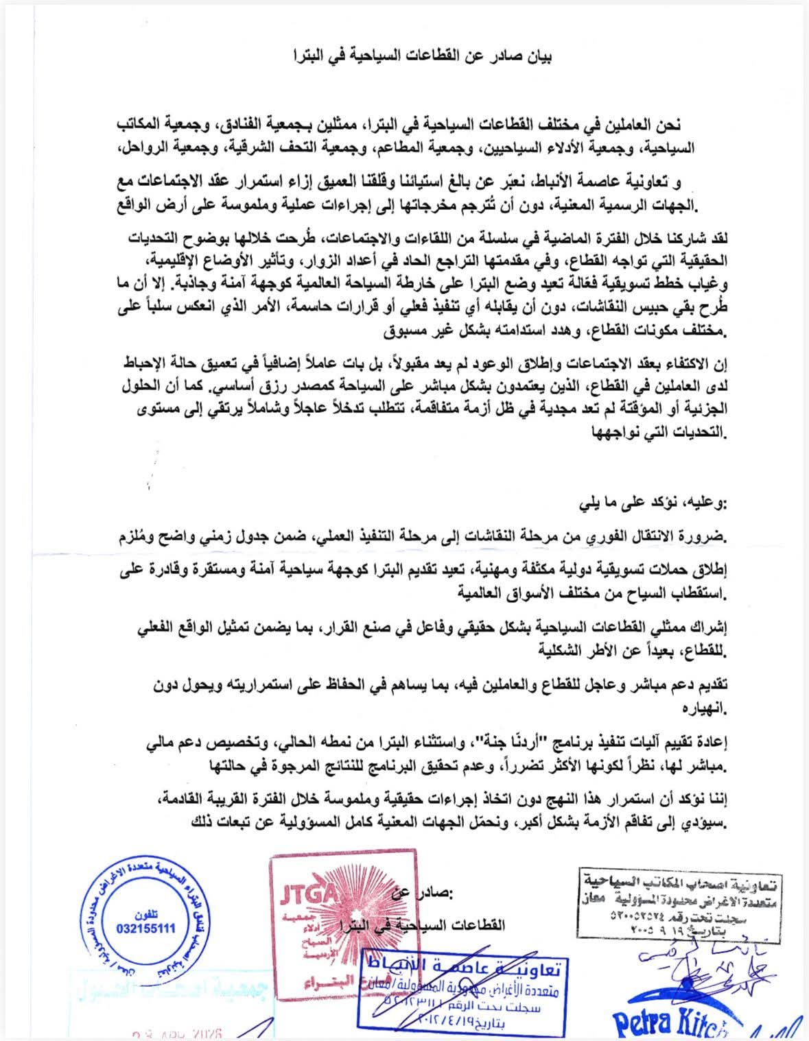 نحن العاملين في القطاع السياحي في مدينة البترا، من أصحاب فنادق ومكاتب سياحية وأدلاء سياح ومطاعم ومحال تجارية ومقدمي خدمات، إلى جانب أبناء المجتمع المحلي، نعبّر عن بالغ قلقنا واستيائنا مما تمر به المنطقة في الآونة الأخيرة، والذي يأتي امتدادًا لمعاناة مستمرة منذ عدة سنوات.