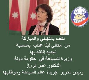 رئيس تحرير جريدة عالم السياحة وموظفيها يهنؤن معالي لينا عناب بتجدد الثقة اعلانات-واخبار-قصيرة-Ads-and-short newsالأخبار السياحيةTourist News في يونيو 14, 2018 9٬800 مشاركة نتقدم بالتهاني والمباركة من معالي لينا عناب بمناسبة تجديد الثقة بها وزيرة للسياحة في حكومة دولة الدكتور عمر الرزاز رئيس تحرير جريدة عالم السياحة وموظفيها 9٬800 مشاركة